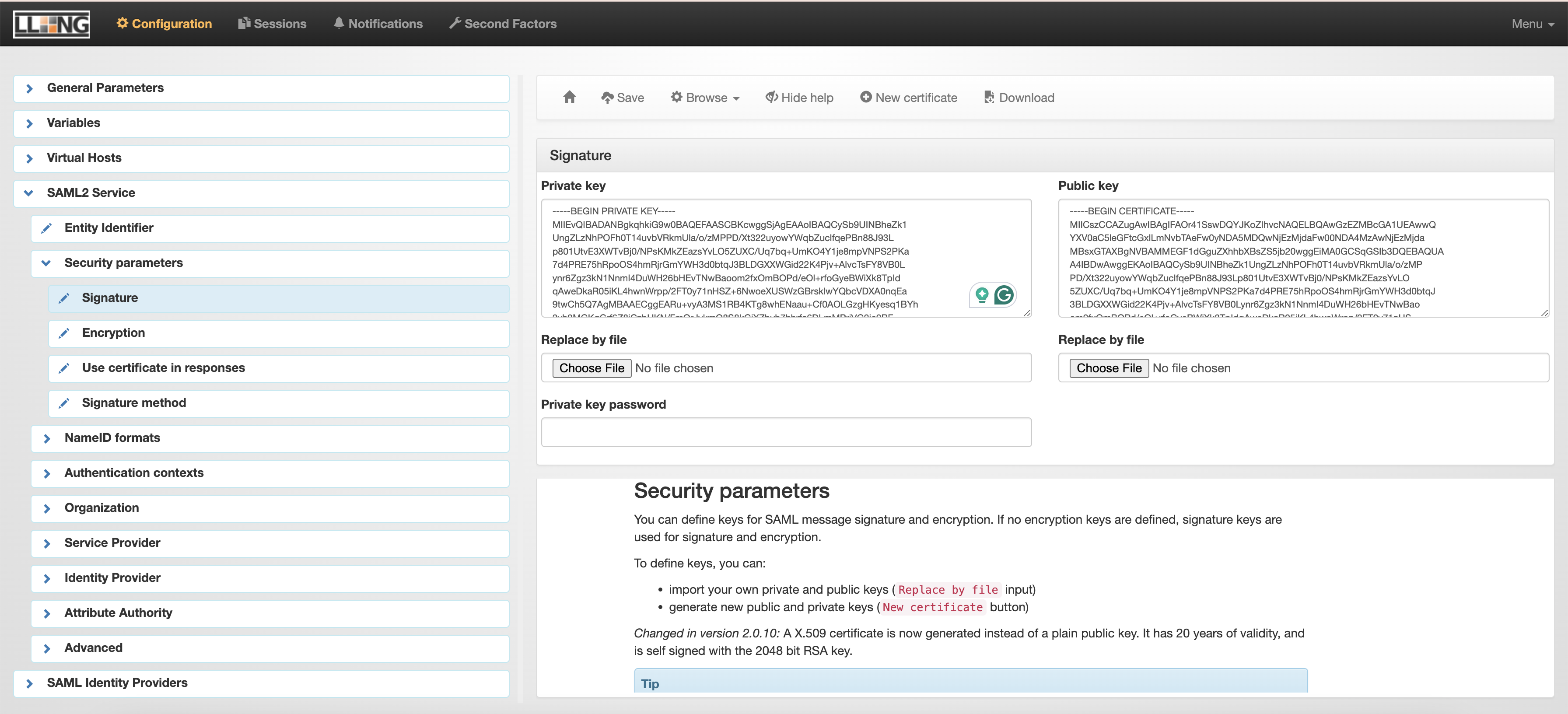 SAML2 Service > Security parameters > Signature > New certificate > Save