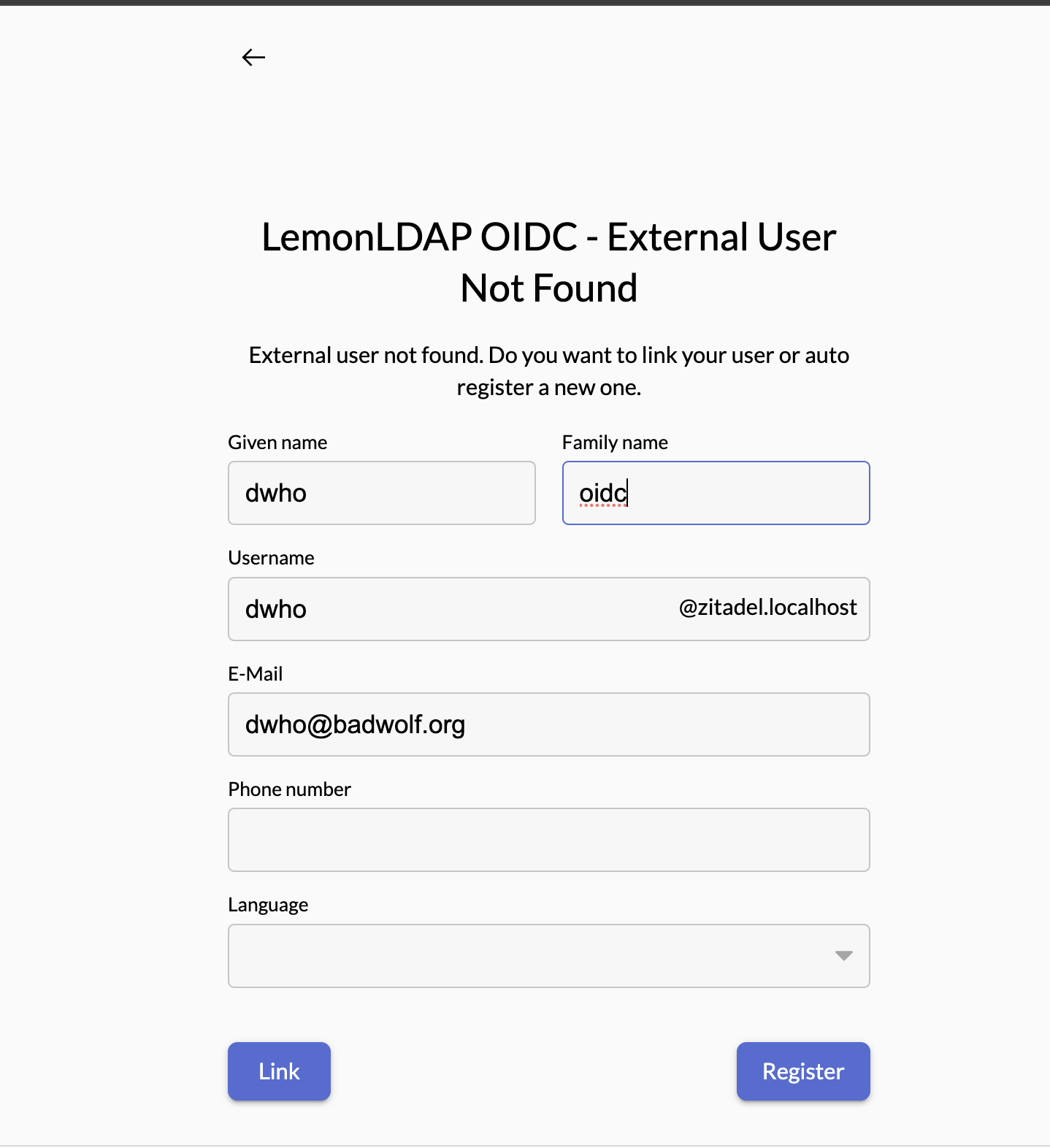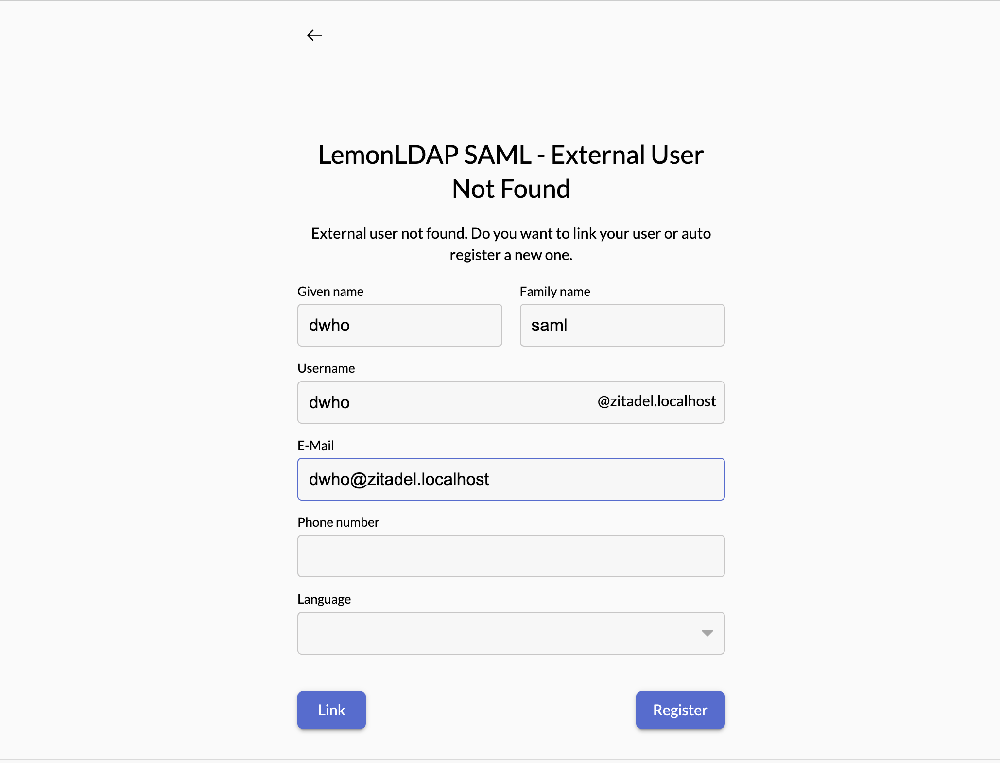 Login successfully, you will be redirected to ZITADEL register form. Completed authentication flow with LemonLDAP SAML.