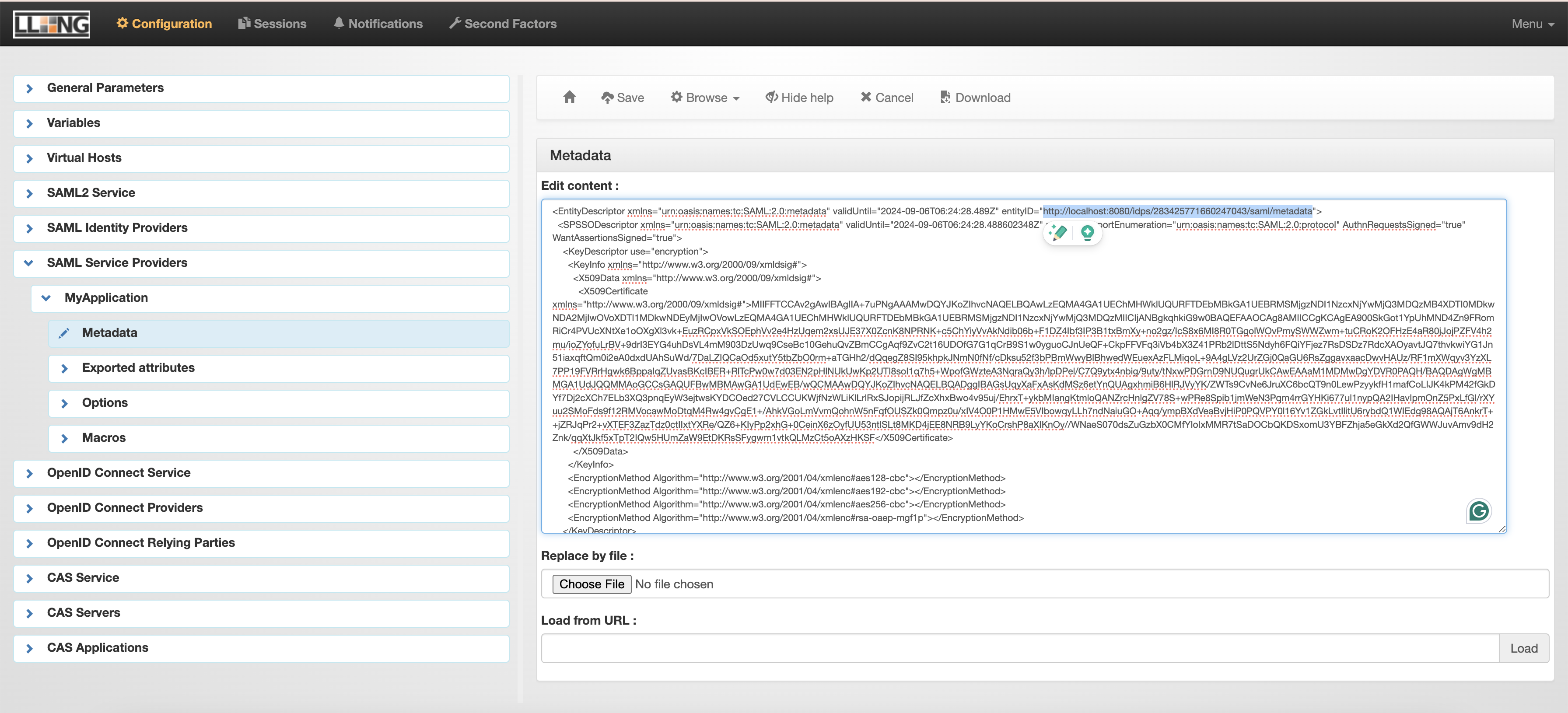 LemonLDAP SAML - Metadata Xml: Base64 encoded metadata