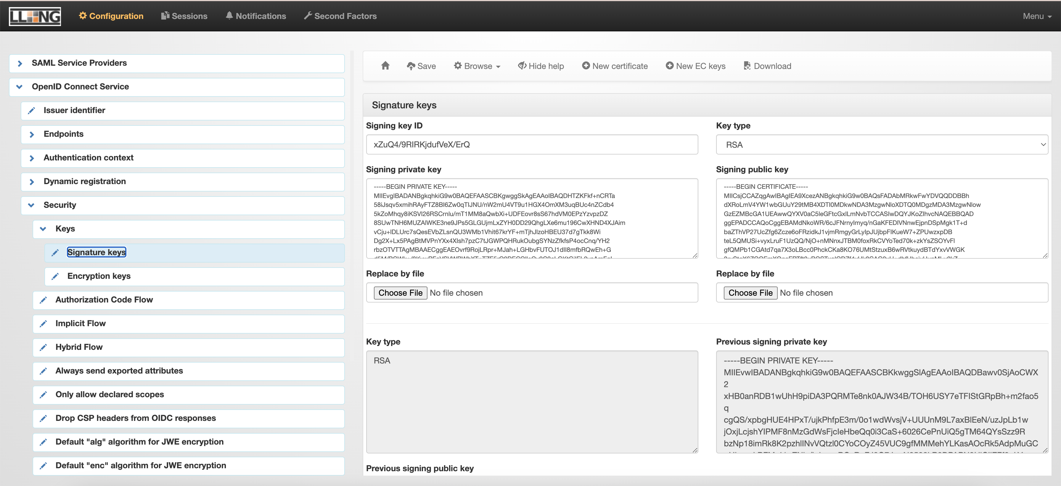 OpenID Connect Service > Security > Keys > Signature keys > New certificate > Save